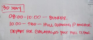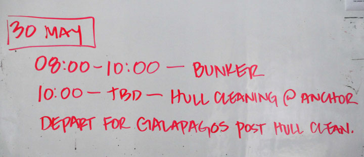 Tomorrow we will move to the cleaning location early, and then be on our way. 3-4 days until we get to the Galapagos. In the meantime, we plan and we dream.