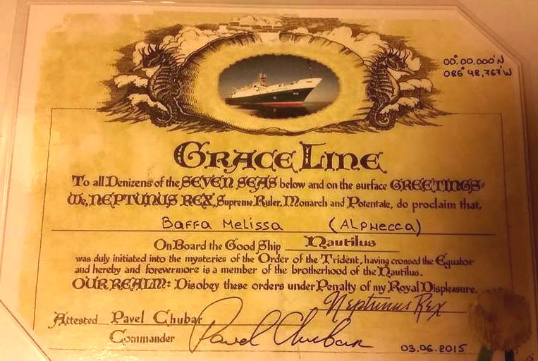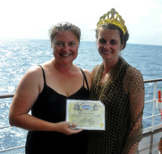 After the last interaction of the day, the ship drew to a halt just short of the equator. All of the “Pollywogs” (people who had never crossed the equator before) were gathered (or should I say herded) to the gym, and the Line Crossing Ceremony resumed. As is the case with other initiation ceremonies, I am not permitted to share the details, but the final result is that King Neptune permitted us to cross the equator, and I am now a “Shellback.” It was a lot of fun, I laughed the whole way through. It helps when you like and trust the people putting you through the initiation.