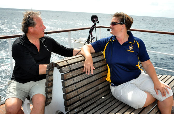 The end of the evening was much more sedate; the full moon climbed high in the sky, and the air was warm and moist enough to be called sultry. The birds that have been repeatedly visiting our ship at night appeared, about 20-30 of them. Commonly called swallow-tailed gulls (Creagrus furcatus), they swooped and soared and dove at the ocean, making a guttural clicking sound when they dove at the water. A flock of about half a dozen brown birds, possibly brown boobies, joined in occasionally, making striking silhouettes against the full moon that hung overhead.I sat on the social deck with several members of the Corps of Exploration and marveled at the birds, snapping photos until my battery gave out. One of the Ukranian crew members joined us on the deck, and he had very little English with which to express his wonderment. Despite our lack of ability to communicate verbally, we exclaimed over the birds and how close they swooped to the deck, how they dove at the water and sprung up like athletes into the air again. With gestures and noises we shared our mutual delight.