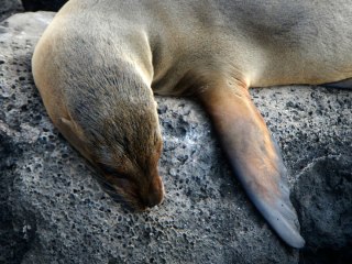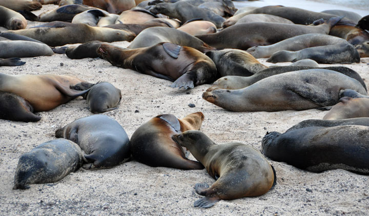 The sea was choppy, and the water crashed over the bow as we plowed through the waves. Sea lions and blue-footed boobies clung to the black volcanic shore. By the time we got to the dock, we were soaking wet. A dozen sea lions were piled all over each other, dozing on the dock. They did not take notice of the half-dozen dripping tourists scrambling out of the zodiac only a few feet away. Everyone in our group laughed and took turns snapping photos.