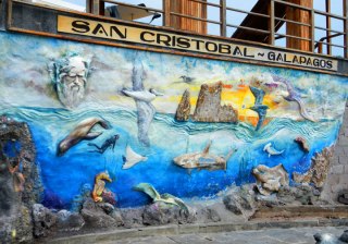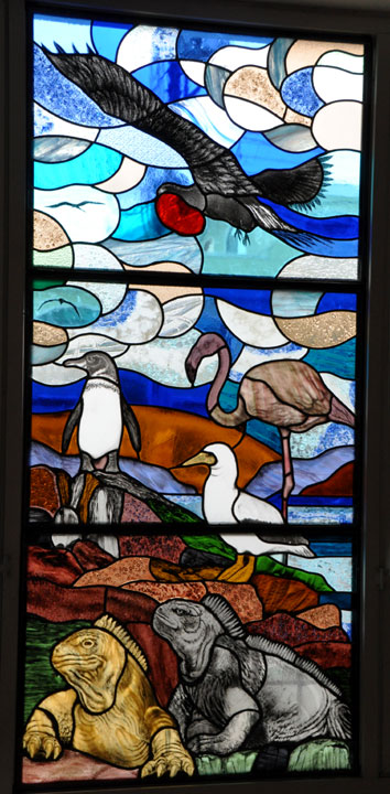 It being the hottest part of the day, Puerto Baquerizo Moreno was quiet: we’d arrived in the middle of siesta. The streets were nearly empty. Sally Lightfoot crabs skittered along the rocks along the water, and sea lions were everywhere: all over the rocks, in a small pool among the tangle of docks and walkways, and even lying on park benches and in a large gazebo. Mother sea lions contentedly nursed their insistent pups, sleek and fat.We waited a while for the other boatloads of our shipmates to arrive, and wandered a while through the hot and quiet streets. Public art was everywhere: murals and fountains, statues and plaques. Volcanic rock had been cut into paving stones. The celebrated animals of the Galápagos were incorporated throughout the small town: into bridges and playgrounds and even in the stained glass of a church we came across. Tears came to my eyes when I realized that I had read about this church a few months ago in a magazine, and now I was standing right here, admiring the very same windows I had read about!