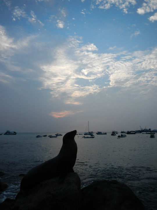 Suddenly, a crew member came bursting into the mess: “They’re catching fish!” he exclaimed in his Russian accent. Outside, it was already full night – darkness comes quickly at the equator. Stepping outside, I could hear a great splashing outside, and there were sea lions all around us, chasing flying fish all around the boat. We wondered aloud if they were attracted by the ship’s lights, or if this was going on throughout the harbor. We stood along the railings to watch, not sure whether to root for the sea lions or the fish.