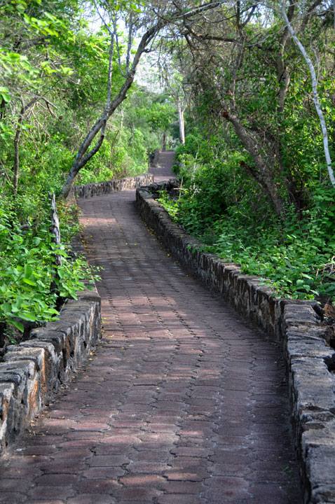 Tortuga Bay. Our next adventure promised us a white sand beach and marine iguanas. It started with a set of steep stairs carved into the rock and paved with the ubiquitous stones cut from lava. A small park office squatted at the top, where we registered with park officials and studied the map.