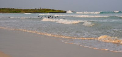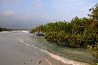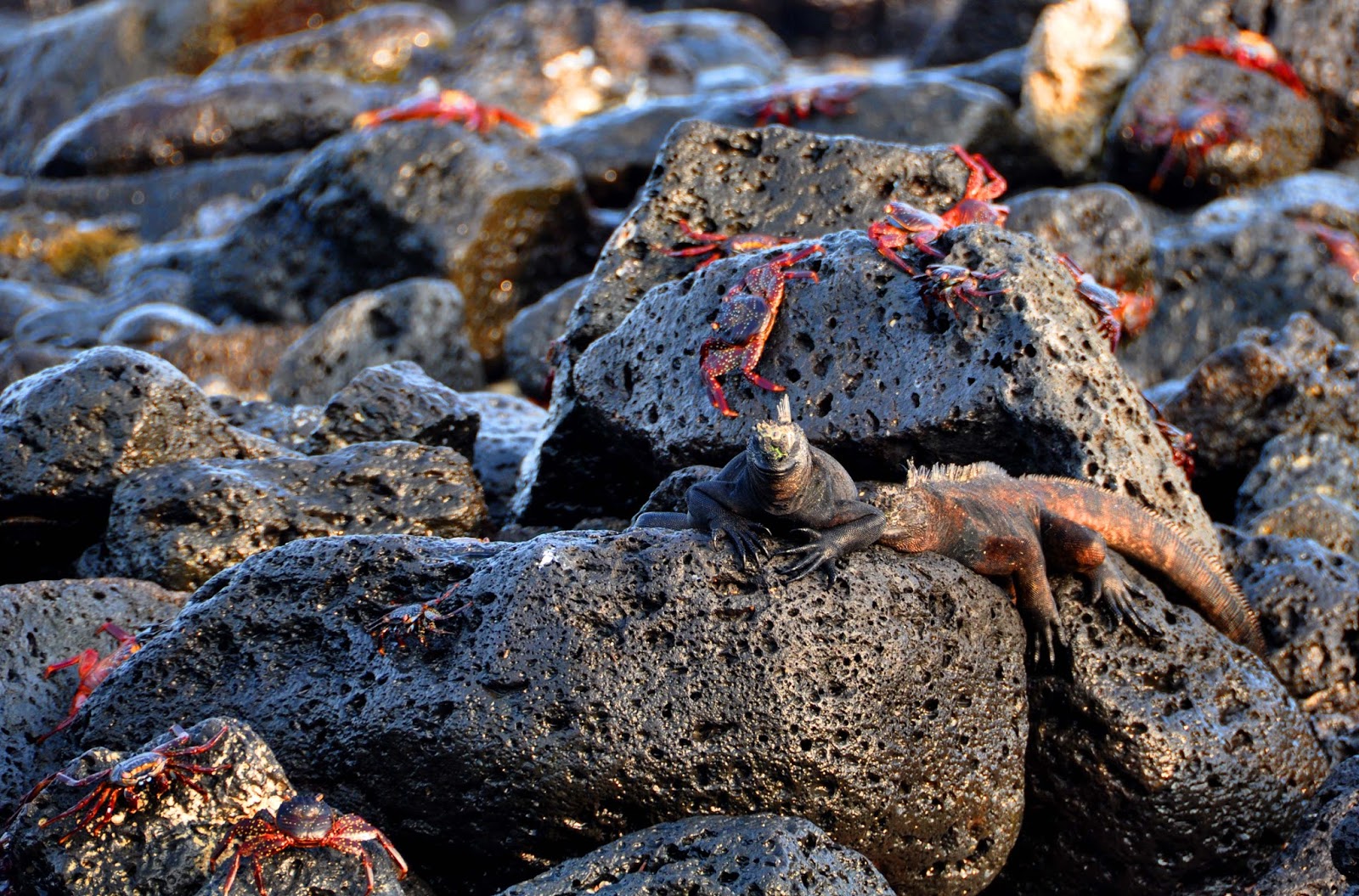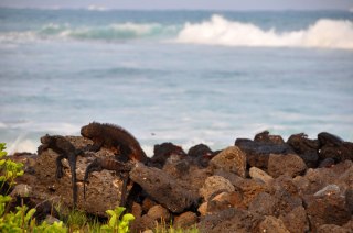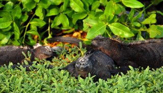 Clumps of mangroves clung to the shoreline on the left, and to the right, a cactus forest decorated the point. Clumps of dozing iguanas lay heaped like puppies beneath the spreading limbs of the mangroves. Out on the point, clusters of dozing iguanas lay in tangled piles on the black volcanic rocks. The white sand gave way to a jumble of shells and large rounded urchin spines; larger lava boulders formed a rough border that prevented further passage out onto the rocks.