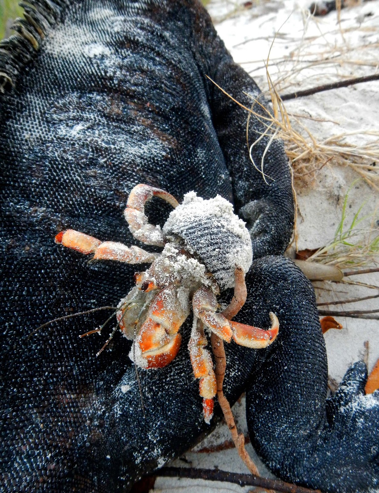 The tide was coming in, concerning us a bit about the long walk back, but we persisted onward. Approaching the point, we saw our first iguanas, sprawled all black and lumpy on the fine white sand. A large hermit crab, seeing us approach, skittered nervously away, climbing over the back of a large iguana in its panic. The lizard only cracked one sleepy eye at the intrusion.