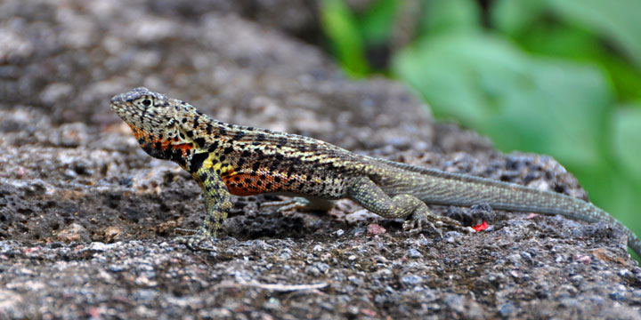 From there, a very long lava stone pathway wound through the native forest, cactus and vines and trees flanking each side. Brightly colored lava lizards scurried along the wall, doing push-ups and eyeballing us warily. Birds flitted in the branches above us, a pair of them advancing curiously as we stopped to photograph them. A small lizard darted between me and the approaching bird, and the bird stopped, cocked its head, and took a small hop forward. We held our breath. Suddenly, the bird lunged forward at the lizard, but it darted away just in time, fleeing across the pathway and up and over the opposite wall. The bird pursued, but the lizard scrambled into the thorny underbrush. Defeated, the bird fluttered back over to us and its companion. We consoled it on its loss and continued on our way.
