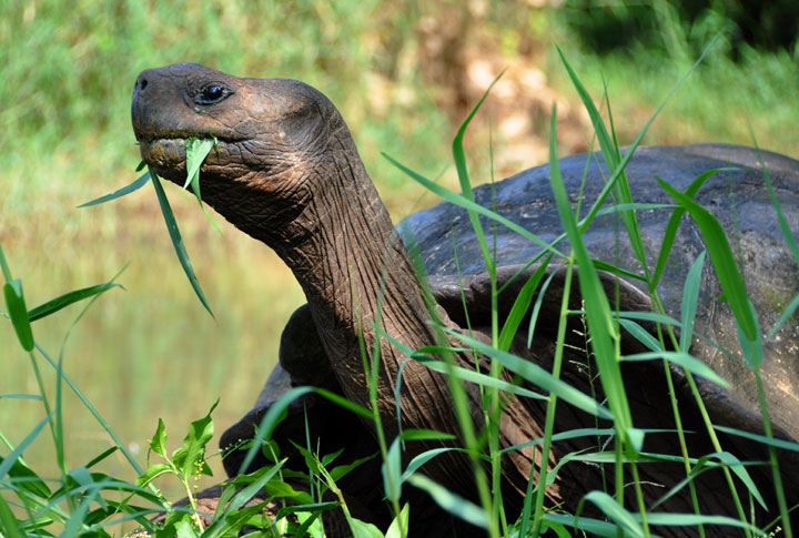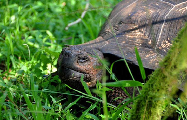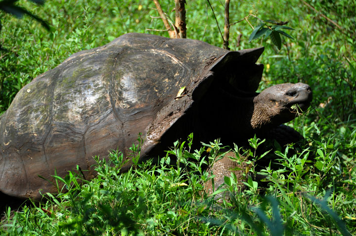 The guide called to us in Spanish: he had spotted a huge tortoise to the left of the trail. We veered off the path into the weeds, gasping and laughing in amazement. The tortoise was munching on plants, an overturned bathtub with legs, so big it was hard to believe.