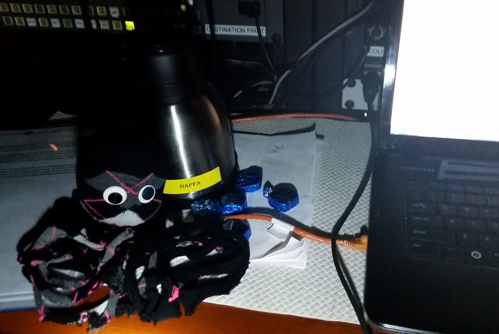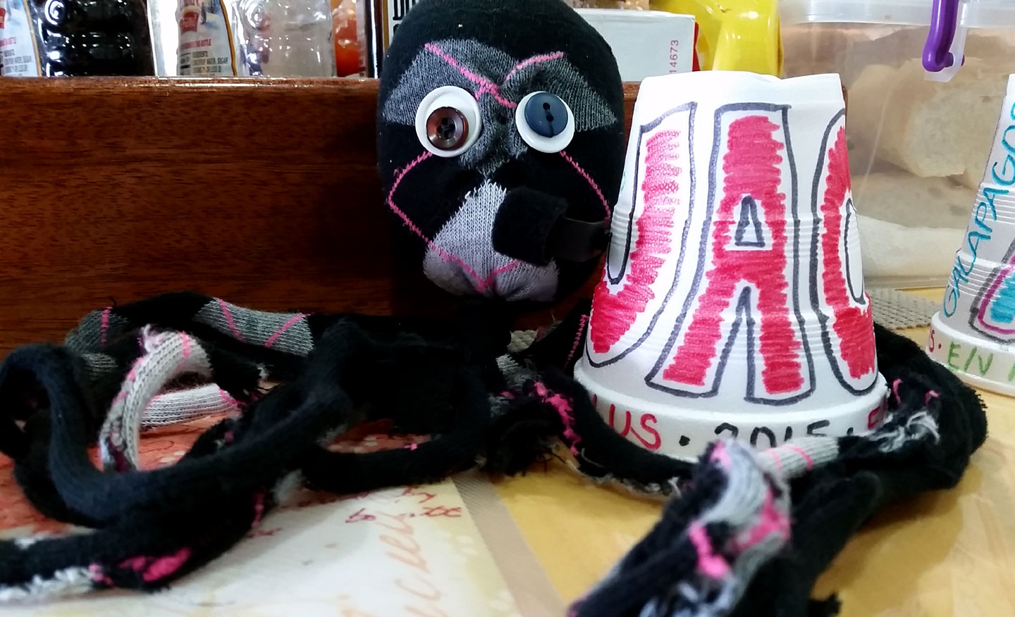 Nice to meet you! My name’s Socktopus. I was inspired by a craft that was done at this year’s Kaleidoscope. I was born back in Ventura, along with a brother and a sister, shortly before this journey to Panama and the Galápagos. Our family helps my human family stay connected in a special way while Melissa and I are away aboard Nautilus.