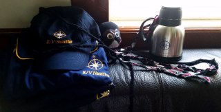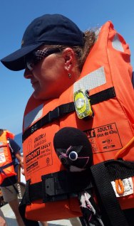 Whenever we get a new group of people on board (we call them onsigners), we do a safety briefing and a drill. I don’t like the loud alarm bell, but I think I look great in orange, don’t I?