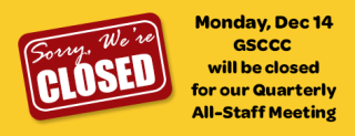 All GSCCC offices will be closed Monday, December 14th for our Quarterly All-Staff Meeting. The GSCCC retail shops will also be closed (per their normal schedule).