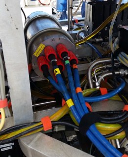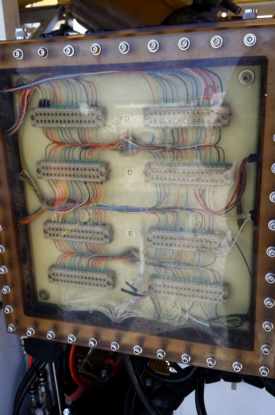 The wires that you saw emerging from the “brains” in the last photo are routed to two different junction boxes, one on each side of the ROV. This photo shows the starboard side junction box, containing half of the wires that have come out from the brain. It is filled with oil (no air bubbles whatsoever), to protect the components from water pressure. The oil compresses very little when Herc is under pressure.
