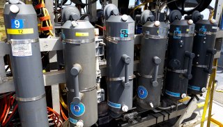 These are Niskin bottles for sampling water. Scientists wanting to know more about the environment may want to study the composition of the water itself, for information like the dissolved oxygen content, salinity, and other chemicals in the water. Sometimes, they are used for biological purposes as well: for example for determining the amount of plankton or bacteria in a particular sample of water from a particular place. These are already in their “ready” positions. They can be triggered remotely to close, sealing the water present in the bottle at that time up tight.