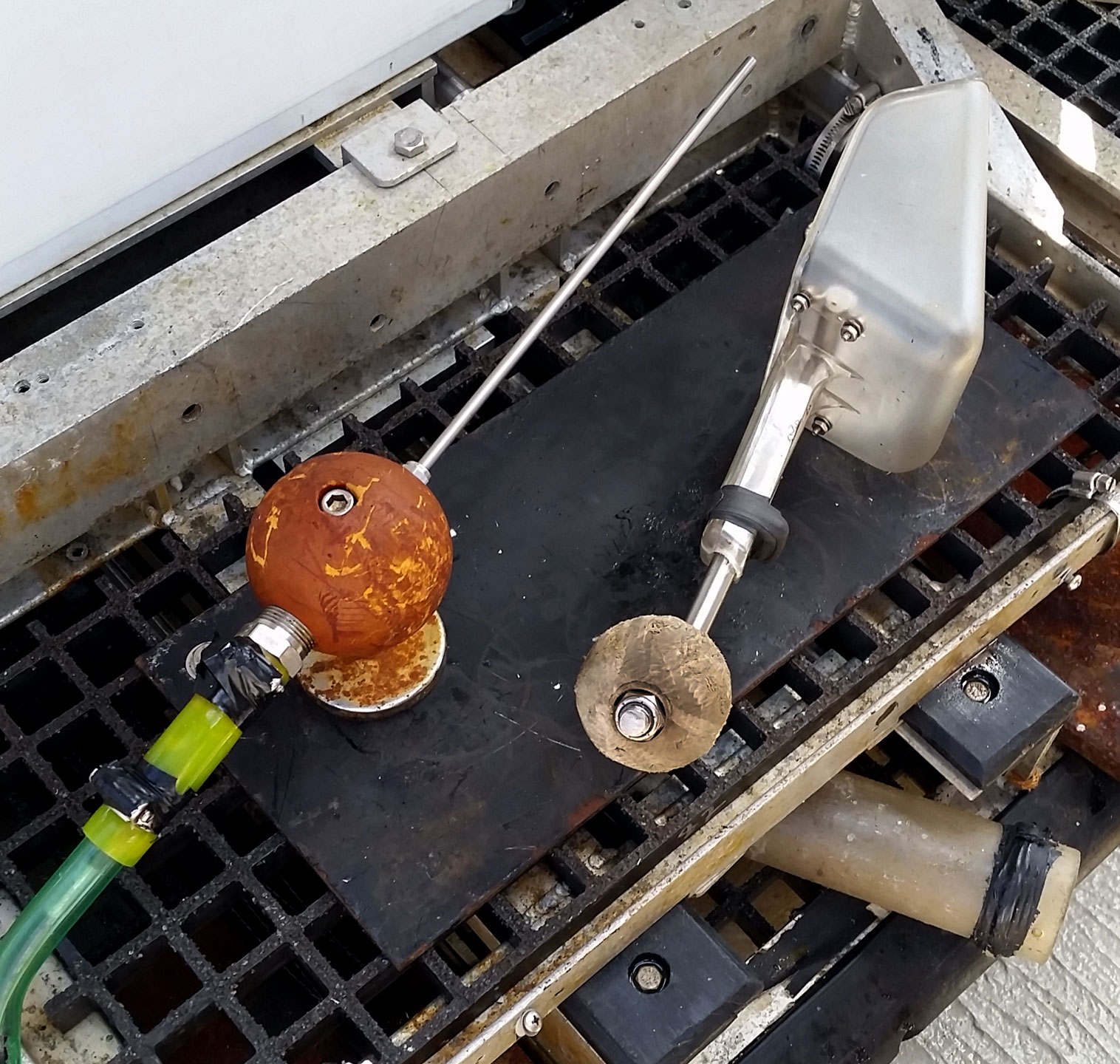 These instruments are a temperature probe, very helpful when you are studying hydrothermal vents, as we were when I took this photo last year, and a scooper for collecting samples. They are held in place with magnets to the “front porch” of the ROV.