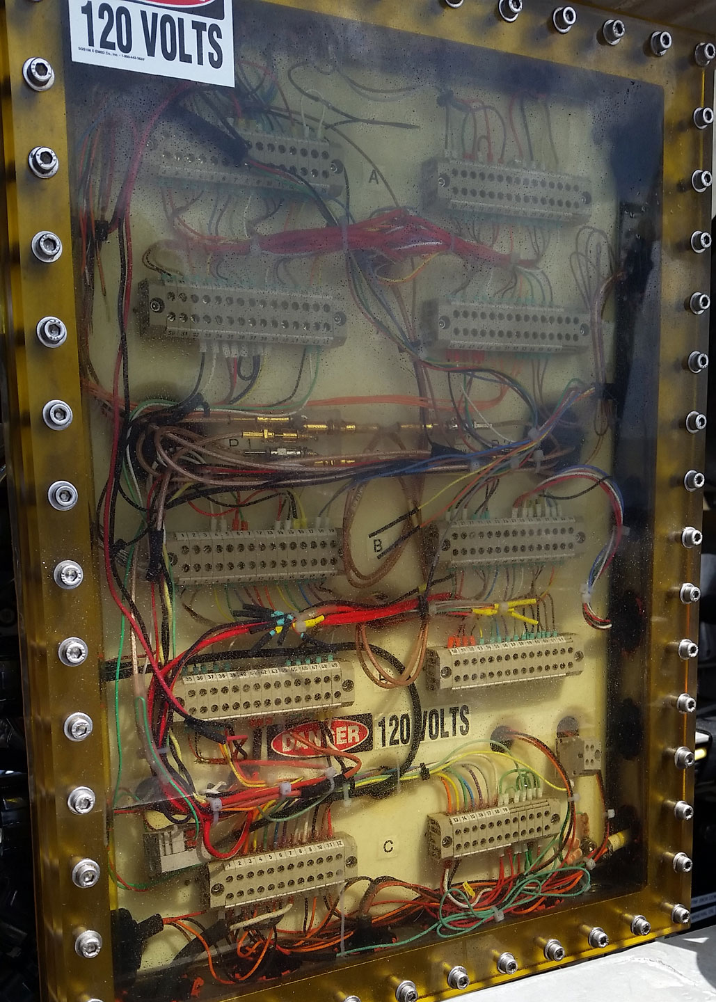 The “brains” of Herc are contained within this titanium tube. The tube alone, just in terms of material and engineering, is worth about $50,000! All of the wires emerging from the brains are contained within the yellow hoses you see here. The wires go out to all of the sensors and cameras and lights throughout the vehicle. But first, they are split into two portions, each of which goes to a junction box on one side or the other of the ROV (next photo).