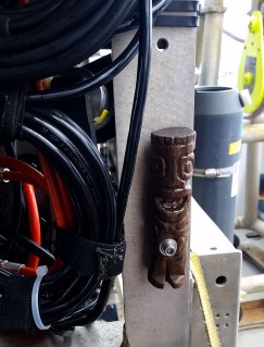 One last and important addition to Hercules is Tiki. Tiki was bolted to Herc 11 years ago during the Titanic expedition on the NOAA ship Ron Brown. They were having issues with the ROV, and Bruce Cowden, the ship’s bosun, carved Tiki out of a piece of driftwood and told the ROV team to mount it on the robot to help dispel the bad energy that was plaguing the little vehicle. It worked, and Tiki has been attached ever since. Bruce insisted that Tiki be anointed in oil before each dive, a practice that continues to this day.