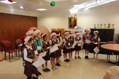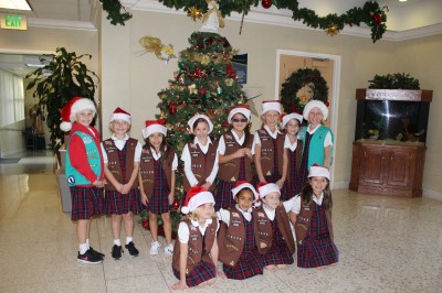Brownie Troop 63036 (and two Juniors from Troop 63035 — older siblings to girls in 63036!) from St. Paschal Baylon School sang Christmas carols and Girl Scout songs to senior citizens at Mary Health of the Sick in Newbury Park on Wednesday, December 7th. The girls also crafted Christmas trees and wreaths beforehand to hand out to the seniors!
