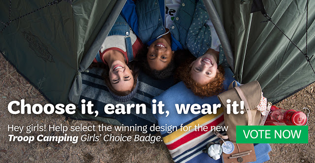 Starting today, until February 17, girls can vote on their favorite design for the Troop Camping badges. After choosing their grade level, they’ll see two designs for the badge they’ll be able to earn this coming fall. That means Junior girls currently in fifth grade will vote on designs for the Cadette badge. And, although girls in 12 grade will not technically be able to earn a badge this fall, we want to hear their voices, too! They can still join the fun and vote on the Ambassador badge.