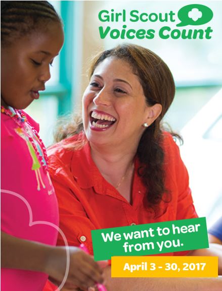In April, Girl Scouts of the USA will be conducting a national survey with girls, parents/guardians and troop volunteers called Girl Scout Voices Count to find out what’s working, and what’s not, in Girl Scouts. We will use your feedback to improve our services and programs.