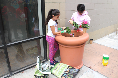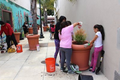 A beautification process took place with girls planting flowers in large flower pots on Street Paseo next to Historic Bank of A Levy building.