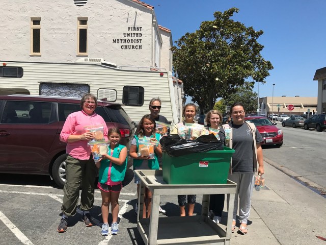Girl Scouts donated them to Dorothy’s Kitchen and also passed out about 55 bagged lunches with boxes of cookies to the needy during First United Methodist Church’s lunch service to the homeless.