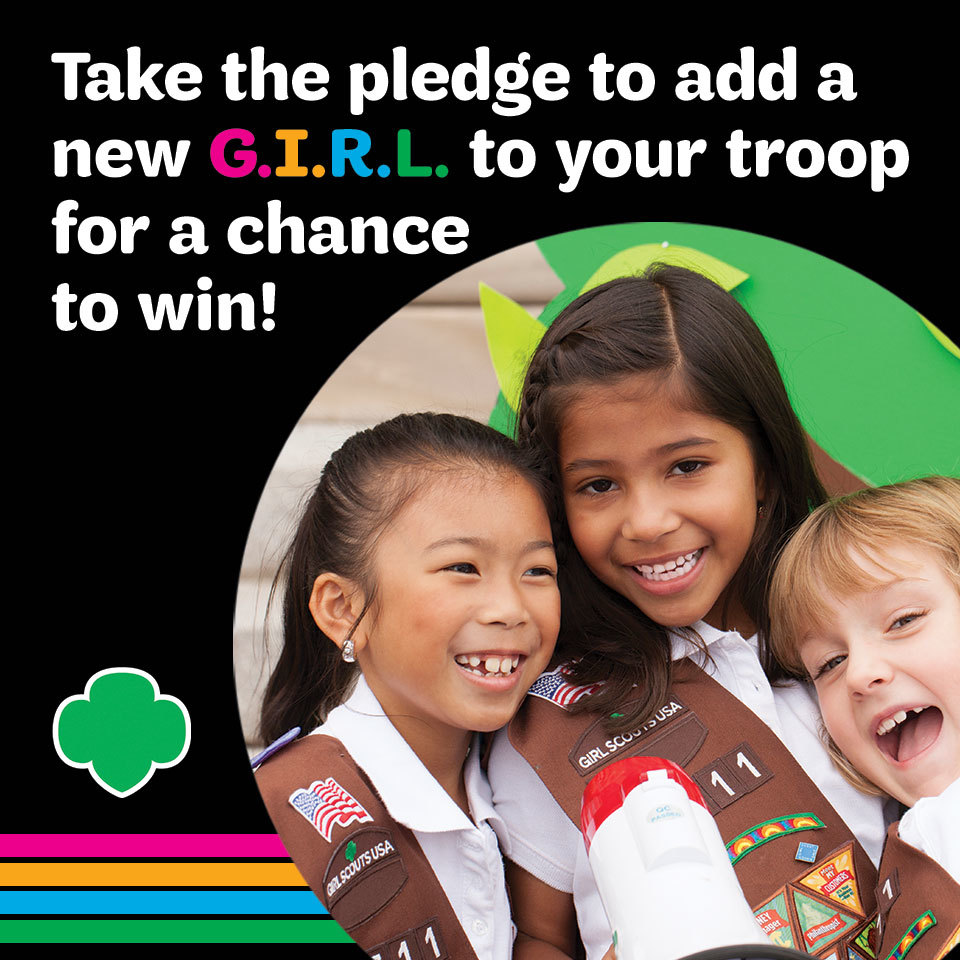 Calling all troop leaders! Through your dedication to the girls you serve every day, you’ve already shown us that you believe in the power of every G.I.R.L. (Go-getter, Innovator, Risk-taker, Leader)™ to stand up, speak out, and accomplish amazing things. Help us unleash that power in even more girls today by pledging to add one or more girls to your troop by March 1, 2018—and you’ll qualify to win some fantastic prizes!