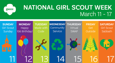 Monday, March 12 – We’re 106 years old today! Girl Scout Birthday – wear your vest to school on Girl Scout Birthday, March 12. Host your own Girl Scout Birthday Party to celebrate and bake a cake with your troop! Send us a photo of your Girl Scout spirit to media@girlscoutsccc.org Check out Girl Scout history.