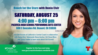 Girl Scouts of California’s Central Coast (GSCCC) is hosting an exciting event on Saturday August 25th from 4:00 pm to 6:00 pm at Pacifica High School Performing Arts Center. Join GSCCC for Reach for the Stars: Tardeada with Dunia Elvir, Telemundo News Anchor, Girl Scout Mom and Troop Leader.
